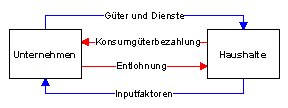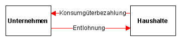 In der VGR werden zur Vereinfachung nur die monetären (roten) Ströme betrachtet. Die realen Ströme (blau) werden weggelassen. Daraus folgt folgender Kreislauf: