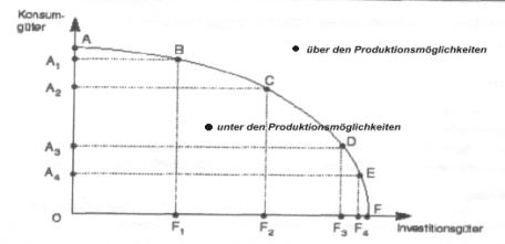 Wie dieser Kurve zu entnehmen ist, sind Punkte rechts der Kurve mit den Produktionsmöglichkeiten nicht erreichbar, während Punkte links der Kurve eine unterdurchschnittliche Auslastung der Produktionsanlagen zur Folge hätten. Eine vollständige Auslastung ist gegeben, wenn sich der Punkt auf der Kurve befindet.
