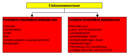 Die Einkommenssteuer ist eine Personensteuer (nur natürliche Personen betroffen), eine Ertragssteuer (Betriebsbeteiligung, Anlage, Mieteinkünfte, Lohn) und eine direkte Steuer (Steuerschuldner und Steuerträger sind identisch; Steuer kann nicht abgesetzt werden).