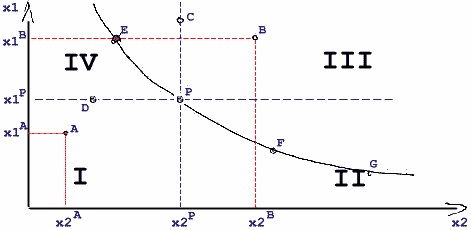 Steuern auf nur eines der beiden Güter würde zu einer Preissteigerung dieses Gutes führen und damit zu einer Drehung der Bilanzgerade nach innen um den Schnittpunkt des nicht betroffenen Gutes mit seiner Achse. Dies geschieht ceteris paribus (=alle sonstigen Bedingungen sind konstant)