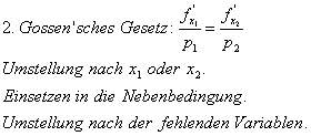 Alternativ kann man auch in das 2. Gossen´sche Gesetz einsetzen und dann nach einer Variablen umstellen, und diese dann in die Nebenbedingung einsetzen: