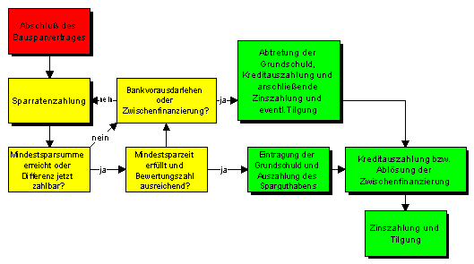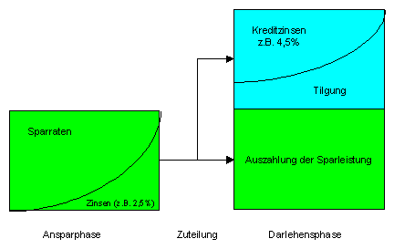 § Vorfinanzierung: wenn die Mindestansparsumme nicht erreicht ist, wird ein Vorfinanzierungsdarlehen zu Kapitalmarktkonditionen gewährt, um die Sparbeiträge vorzukreditieren. Hier sind Zinsen und Tilgung zu leisten.