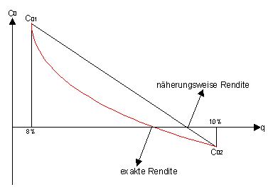 Durch 2 ermittelte Punkte der Renditekurve kann durch lineare Interpolation eine Gerade berechnet werden, deren Schnittpunkt mit der X-Achse näherungsweise der exakten Rendite entspricht.