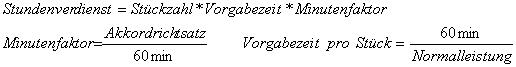 · 10 Stk/h Normalleistung bei 40h pro Woche; 1,- pro Stk.; Akkordzuschlag 20% è400Stk pro Woche =400,- Normallohn +20% Zuschlag=480,-