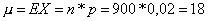 - X entspricht einer Binomialverteilung mit n=900 und p=0,02