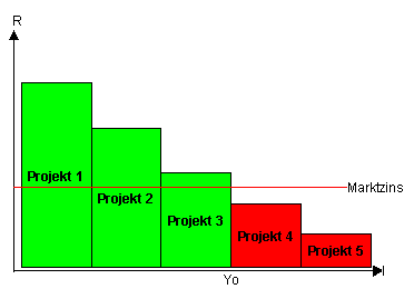 o Grundsätzlich ist die Zahl der Investitionsprojekte mit hoher Verzinsung (Rendite) begrenzt, so dass mit steigender Investitionssumme die Rendite sinkt. Solange die Rendite jedoch über dem Marktzins liegt, lohnt sich die Investition trotzdem.