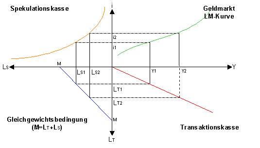 · je höher das Einkommen ist, desto mehr Geld benötigen die Haushalte, da häufiger unvorhersehbare Ereignisse eintreten. Jedoch je höher der Zins ist, desto teurer wird die Geldhaltung (Opportunitätskosten), weshalb die Subjekte bei steigendem Zins ihre Geldhaltung abbauen.