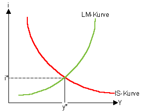 o Es gibt somit ein Gleichgewicht in diesem Modell, d.h. es existiert ein Einkommen y* und ein Zins i* bei dem sowohl der Geldmarkt, als auch der Kapitalmarkt im Gleichgewicht sind